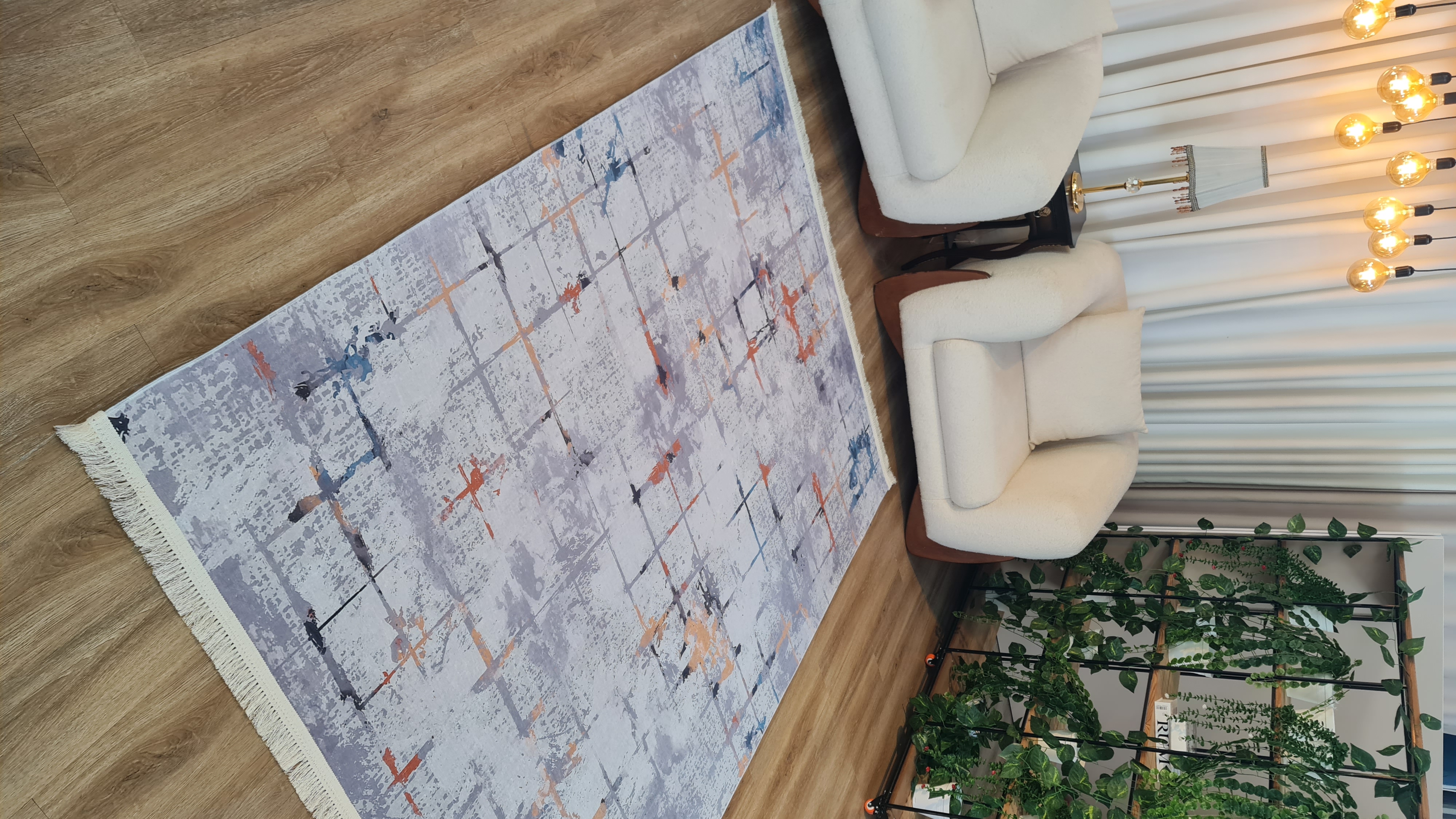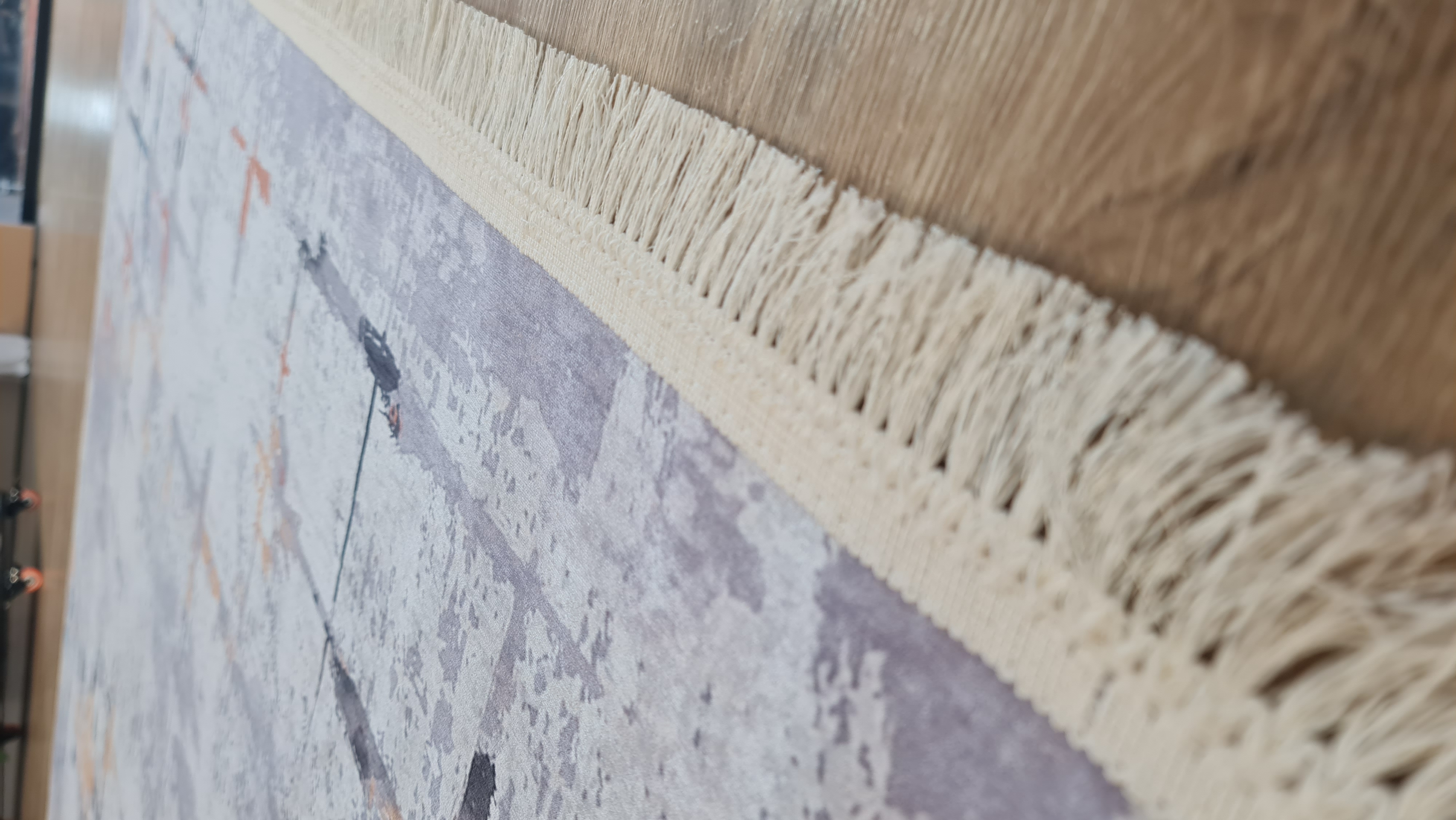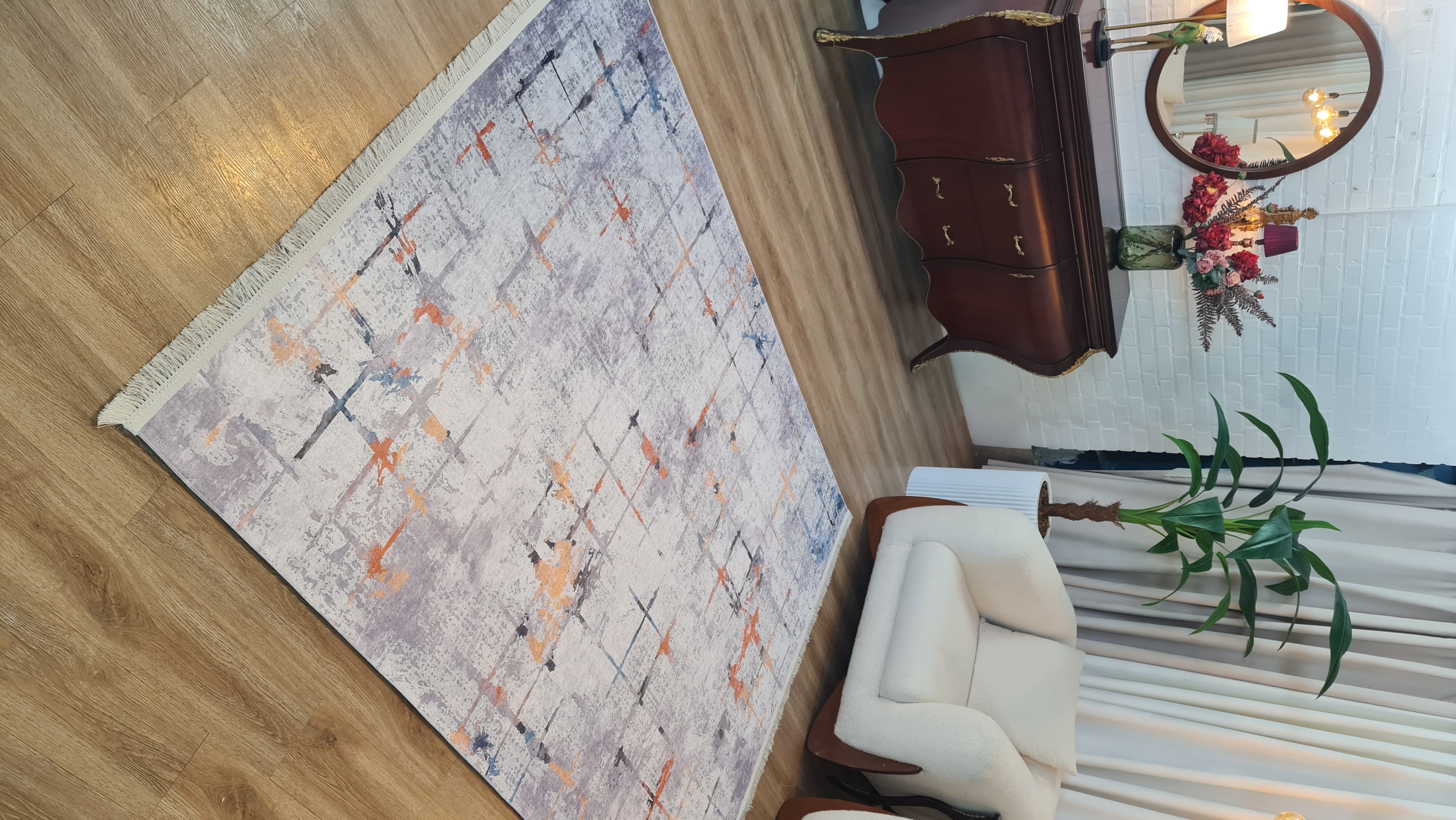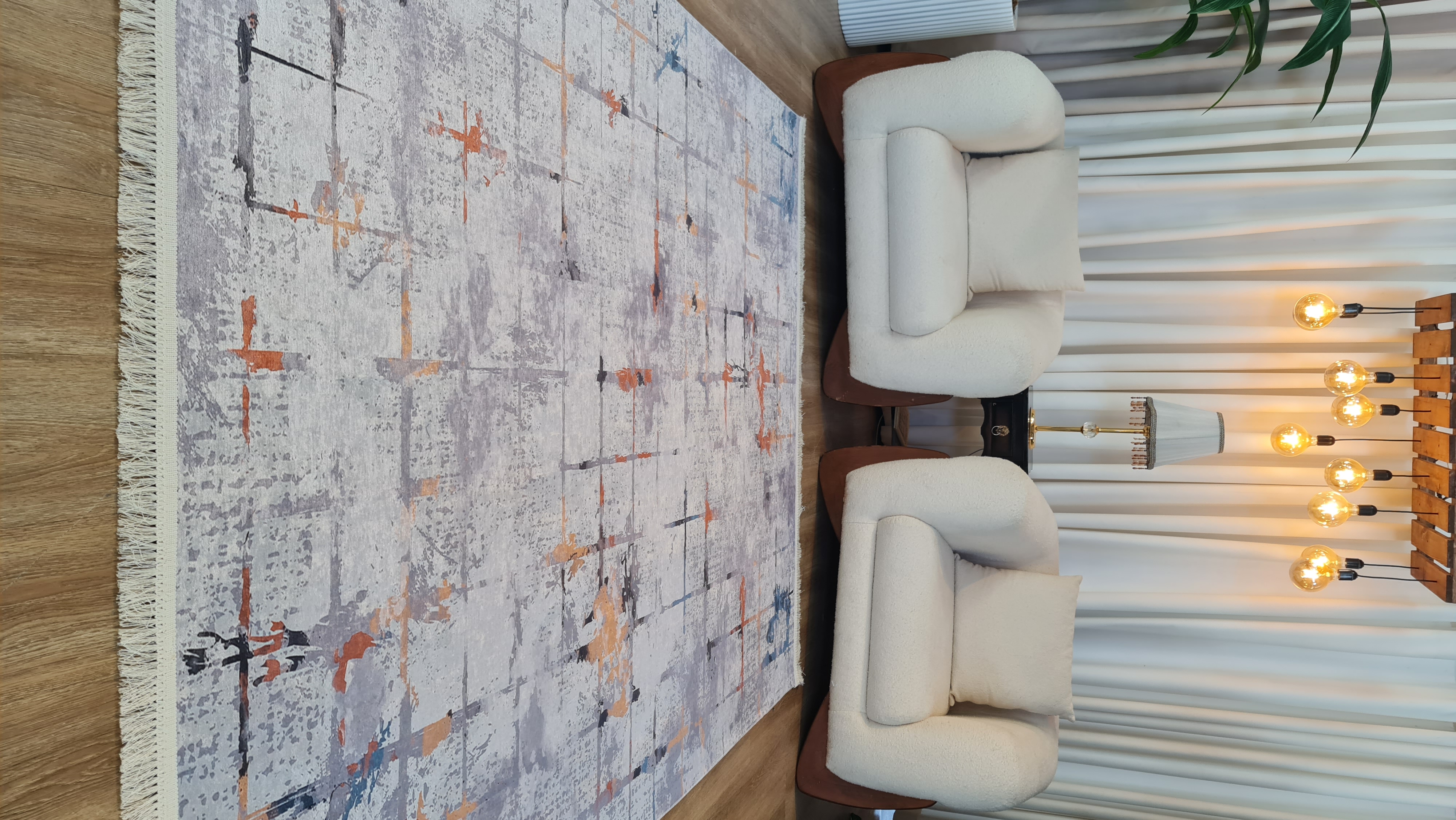 در نگاه اول، چیزی که در این فرش جلب توجه میکند طراحی انتزاعی و ترکیب هوشمندانه رنگهاست. استفاده از طیف طوسی و کرم در کنار رگههای نارنجی و آبی، باعث شده فرش نه بیشازحد ساده باشد و نه شلوغ؛ دقیقاً همان تعادلی که در دکوراسیونهای مدرن و امروزی بهدنبالش هستیم.